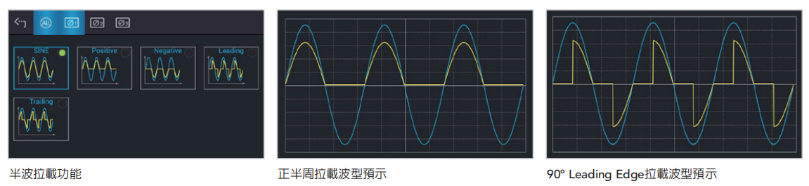 Chroma 61809/61812/61815回收式交流负载,于CC Rectified Mode提供半波拉载功能。在电压、电流为正弦波条件下,可提供正半周、负半周拉载,以及模拟SCR/TRIAC开关特性的90度Leading Edge、Trailing edge半波拉载。使用者可藉由拉载半波电流,模拟调温/调光的家用电器、保护开关、感应马达等相关待测物的负载特性,测试电压源的输出稳定度。