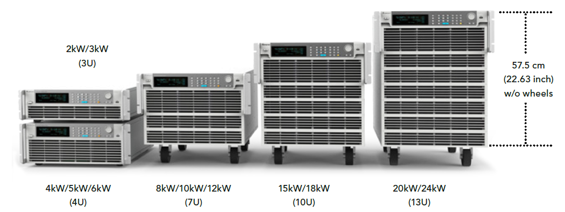 63200E系列共有5种高度、12种功率、3种电压,共计36个型号。超高功率密度设计,颠覆高功率电子负载体积大、移动不便的观念,能为实验室节省不少空间,同时能轻松解决自动测试系统更新电子负载时的空间议题。