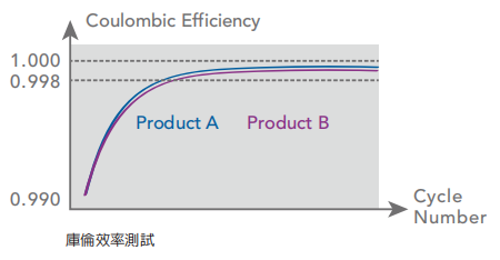 将电池满充电后再满放电测试,计算电池放出/充入电荷量可得到库伦效率。Chroma 17010的高精度与稳定度能分辨出特性良好的电池库伦效率,而精准的库伦效率测试能凭借少量循环来预估电池寿命。