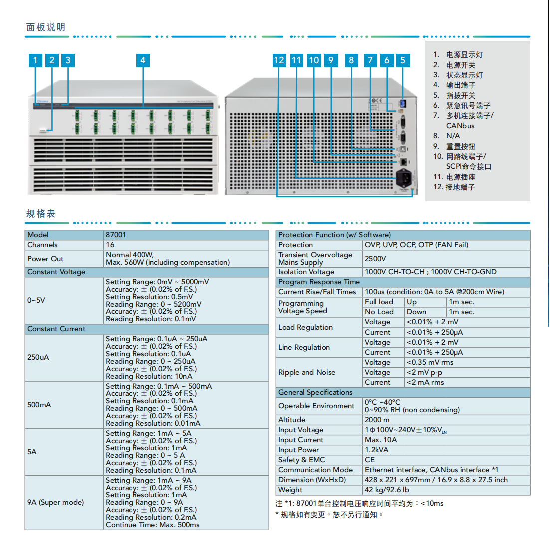 Chroma 87001电池芯模拟器是一款多通道、高精度、以及可程控的双向直流电源,同时具备电压源与电流源功能,可做为多通道的直流电源或电子负载使用。